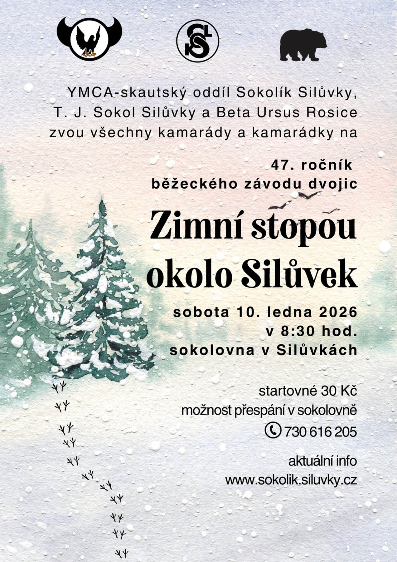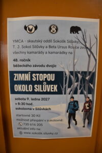V sobotu 10. ledna 2026 se uskutečnil 47. ročník legendárního zimního závodu dvojic “Zimní stopou okolo Silůvek” pořádaný Sokolík Silůvky, 4. odd. YMCA Skaut. Letos trasu absolvovalo 86 registrovaných dvoučlenných (a v několika případech i trojčlenných) hlídek (180 osob) všech věkových kategorií. A trasu závodu si přišla také projít spousta zájemců bez registrace. Všichni účastníci se na závěr sešli při vyhodnocování akce v sokolovně v Silůvkách, jak dokládá přiložené foto. Velké poděkování patří všem, kteří se na realizaci této akce jakkoliv podíleli a s nadšením strávili celý den na kontrolách v okolních lesích za mrazivého počasí. Neboť letošní Zimní stopa byla opravdu pořádně zimní a celá akce se skvěle vydařila.